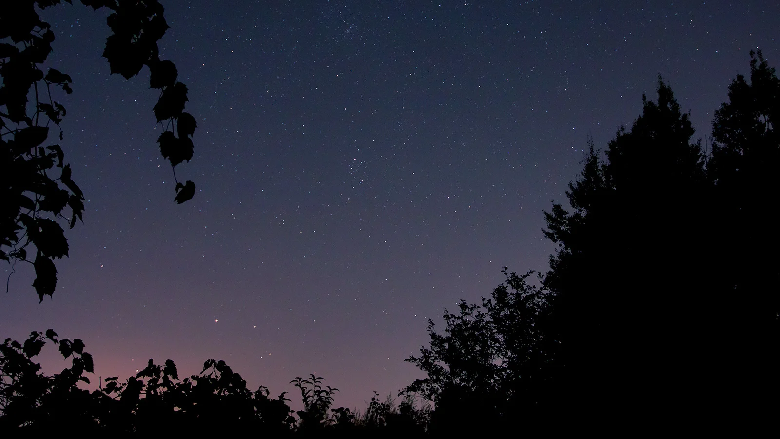 Stars in the night sky being framed by trees on a moonless night in Southern Ontario. Image by Dennis Marciniak of denMAR Media.