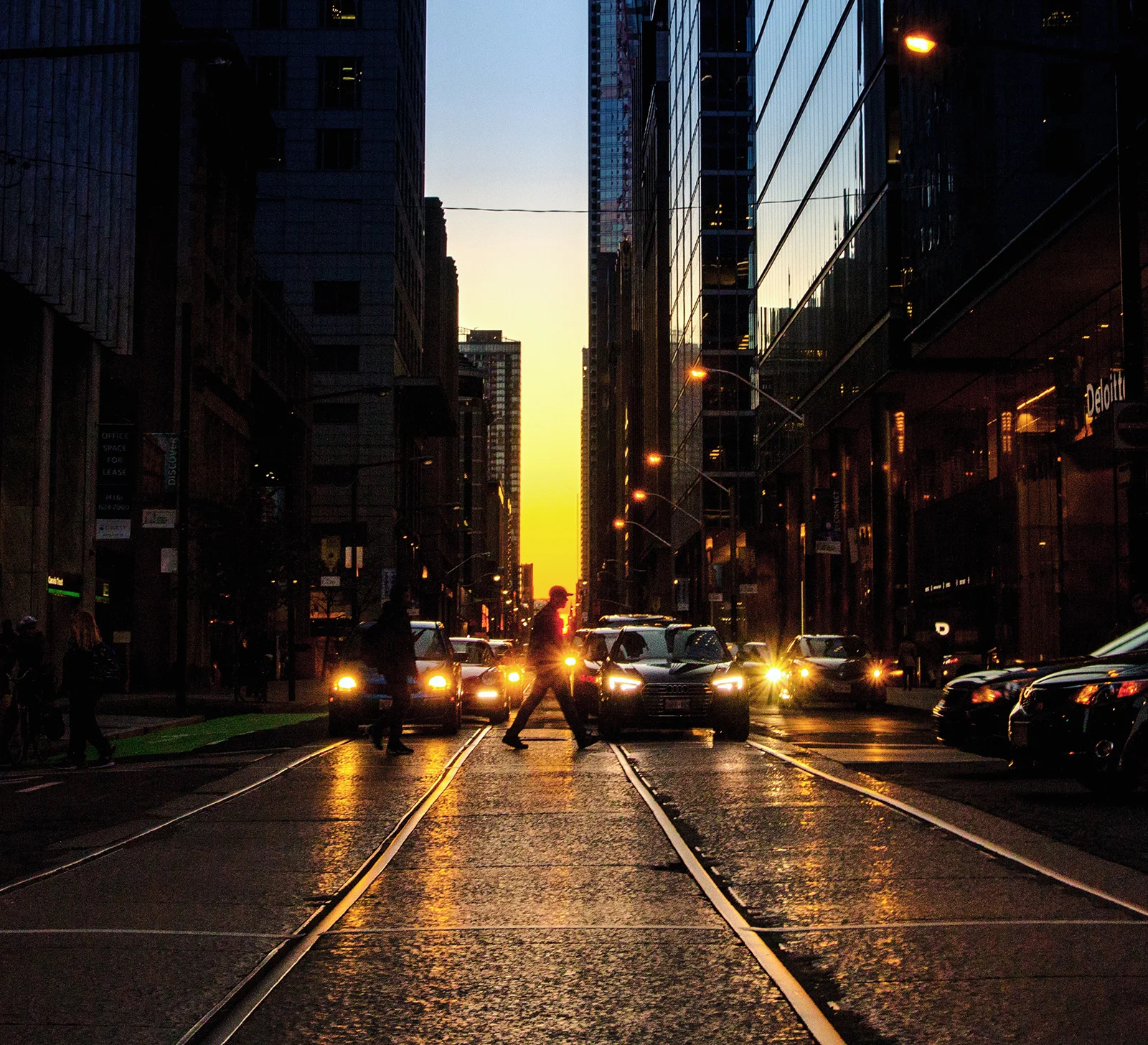 A man walking across the street over streetcar tracks during a sunset at Yonge and Adelaide in Toronto, Canada. Photo taken by Dennis Marciniak of denMAR Media.