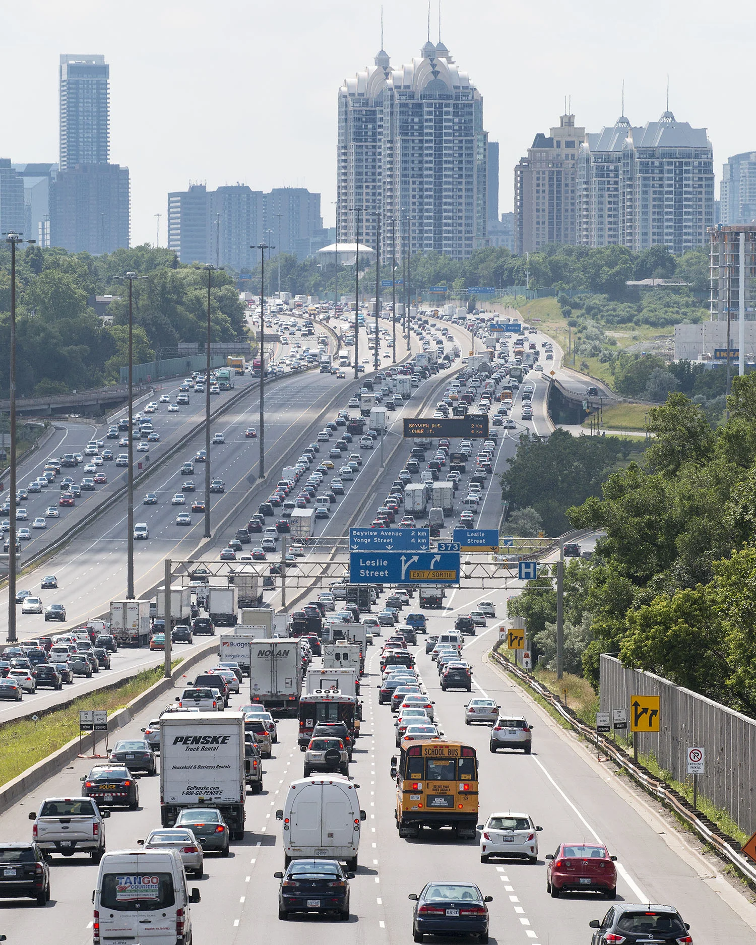 Traffic on Highway 401 going Eastbound during a typical weekday rush hour period in the heat of the summer. Image by Dennis Marciniak of denMAR Media.