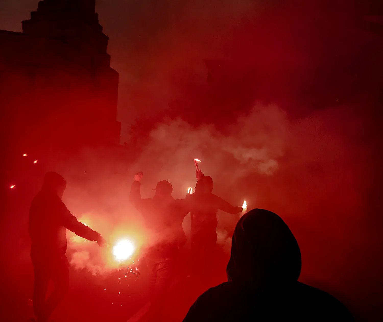 Toronto FC fans from various supporters' groups march to BMO Field in 2017 amidst red smoke and flares. Red Patch Boys, U Sector, Kings in the North, Inebriatti, Original 109 and Tribal Rhythm got together to organize this march. Image by Dennis Marciniak of denMAR Media.
